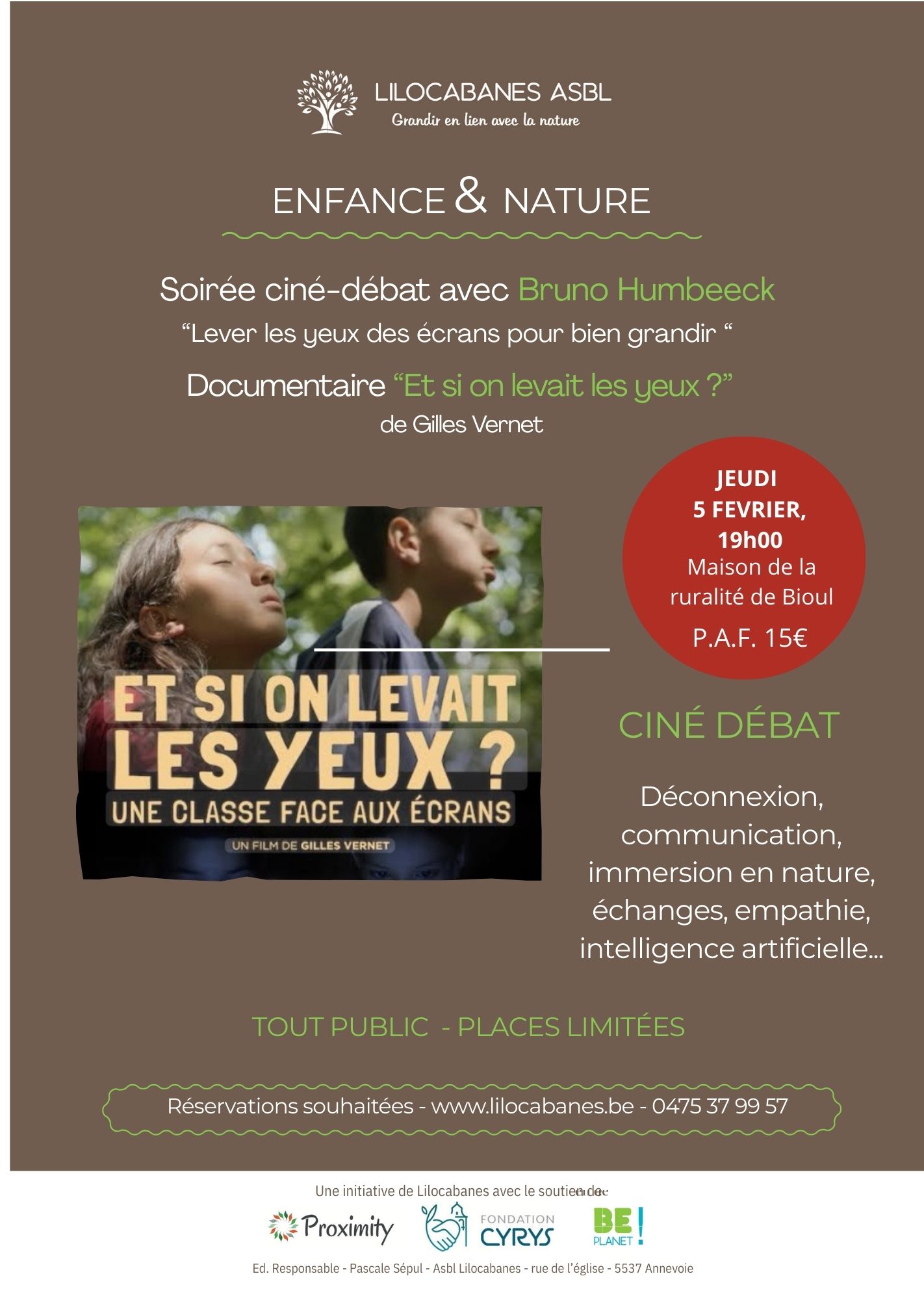 Le prochain Ciné-débat, "Lever les yeux pour grandir" se tiendra le jeudi 5 février à 19h, dans les locaux de la Maison de la Ruralité, place Vaxelaire, à Bioul (Anhée). Pour alimenter le débat, le documentaire « Et si on levait les yeux ? » relève d'une expérience unique menée par un instituteur réalisateur et sa…